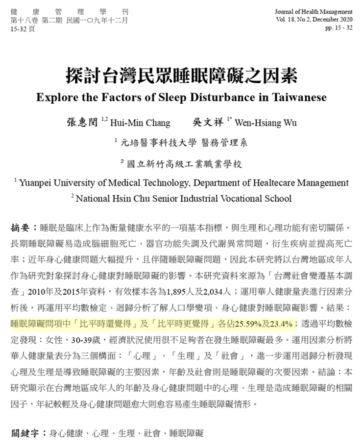 台灣民眾平均睡眠時數是亞洲倒數第三,全球排名倒數 6~10 名,民調顯示,現今國人將近 4~5 人中就有一位有失眠困擾,慢性失眠症盛行率為 10.7%。