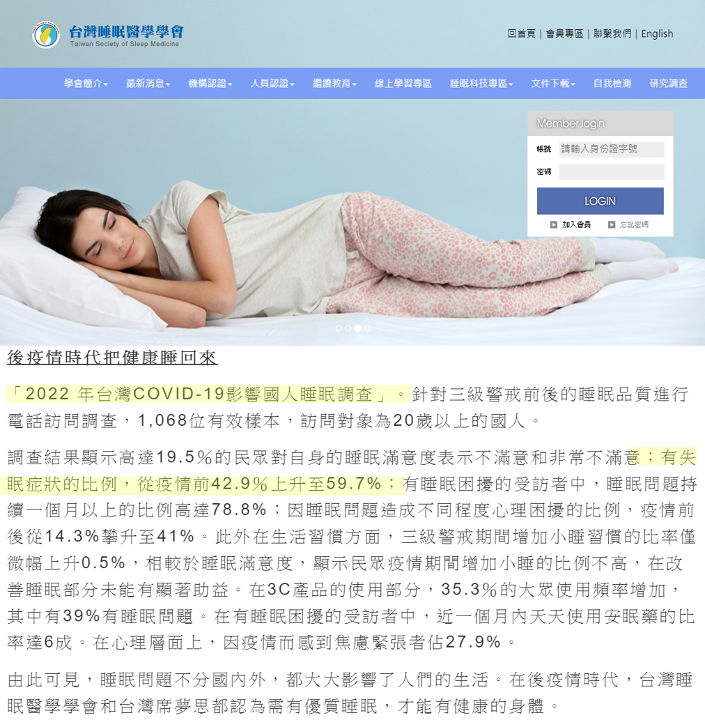 2022 年台灣睡眠醫學學會針對 COVID-19 影響國人睡眠調查,也顯示國人因為疫情影響,導致出現失眠症狀的比例,從疫情前 42.9%上升至 59.7% 。